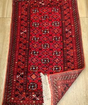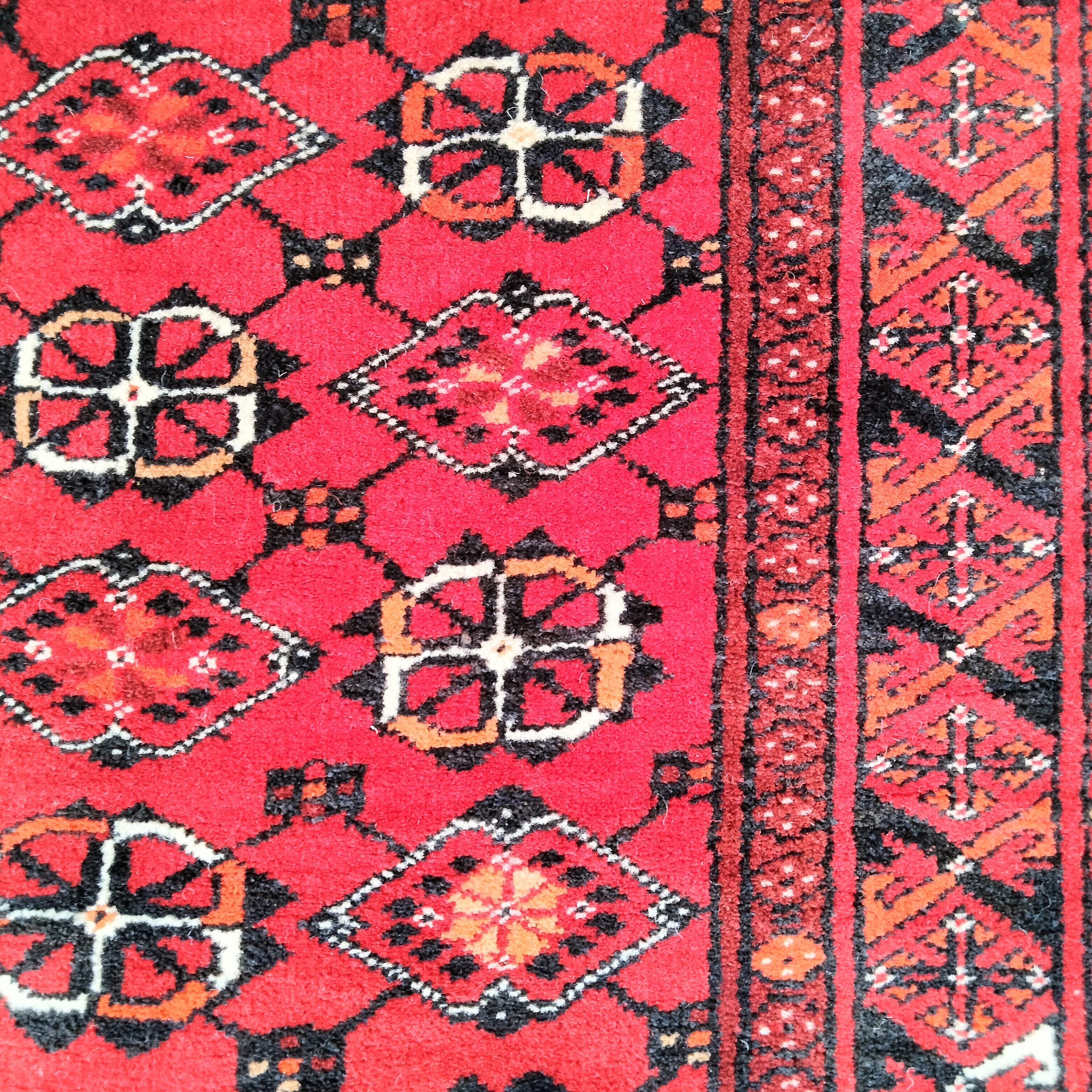 1980年代に旧ソ連のアフガニスタン侵攻時にアフガニスタンからパキスタンに逃れたトゥルクメン系アフガ二スタン人が織ったトゥルクメン絨毯です。トゥルクメンのリンゴの花模様可愛いらしいバシリーモチーフの絨毯ですが、品質は質実剛健で丈夫な作りです。