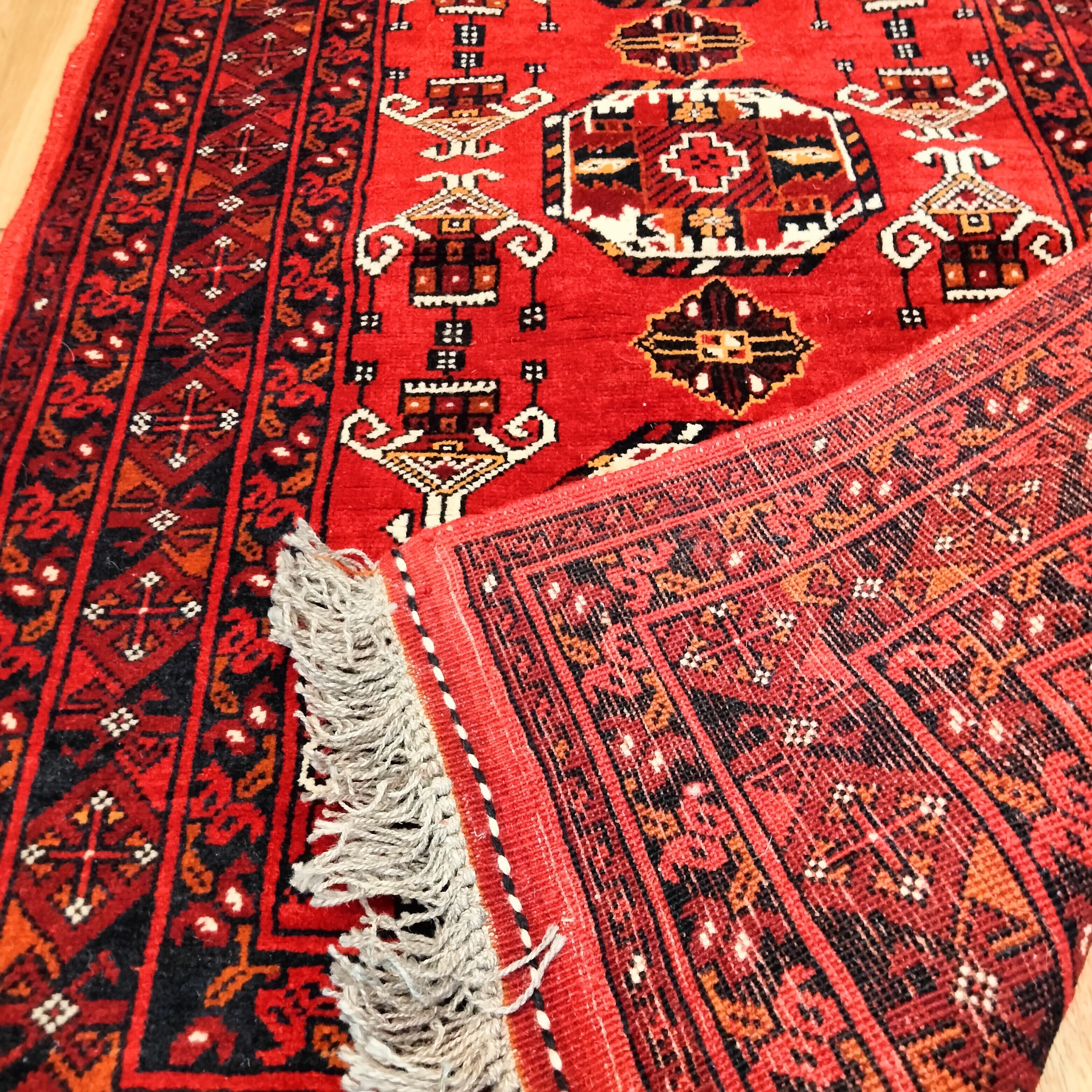 1980年代にソ連のアフガニスタン侵攻時にパキスタンで作られたアフガニスタンからパキスタンへ逃げたトゥルクメン系アフガニスタン人の絨毯です。無骨で丈夫な作りです。未使用 ウール100%