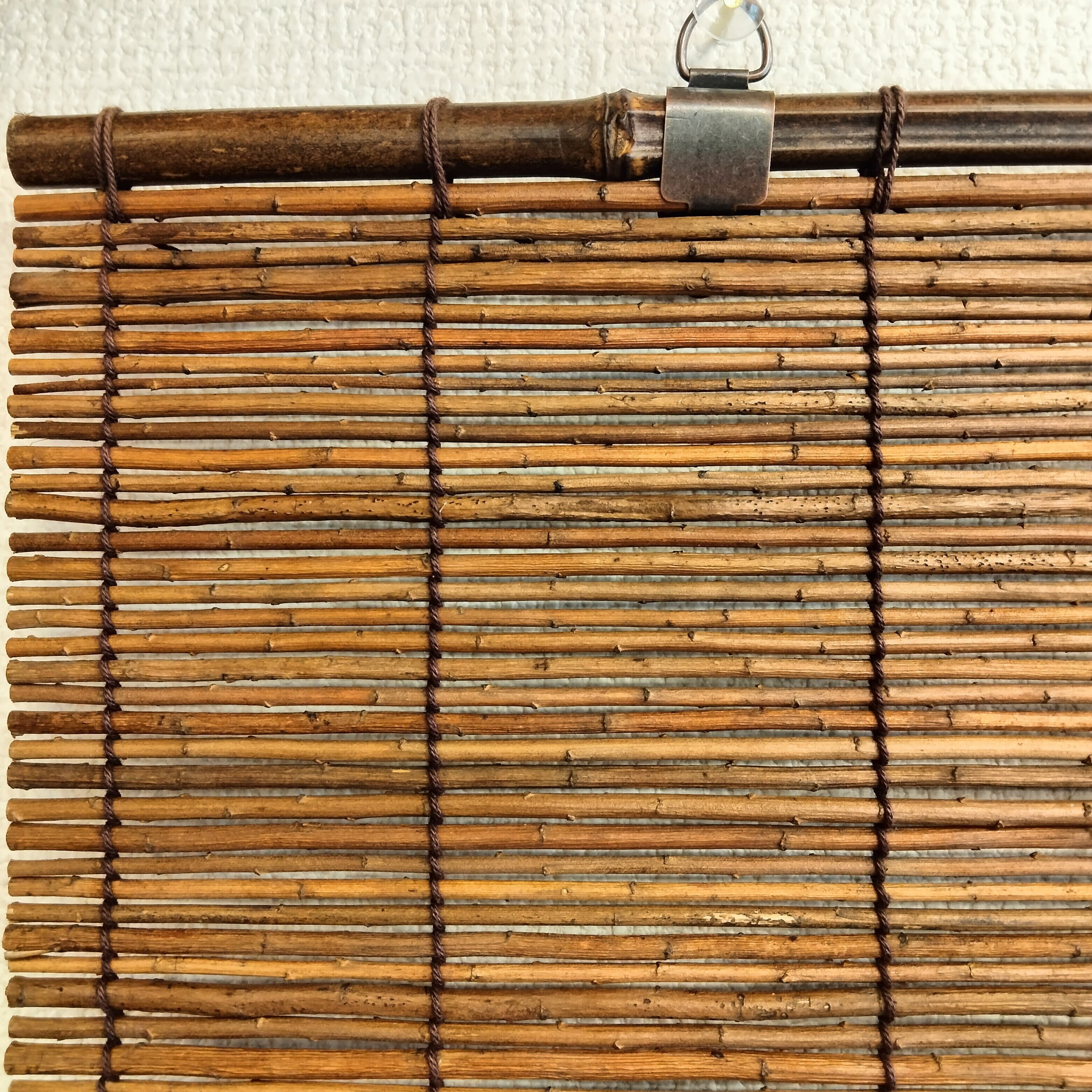 埼玉県、茨城県の山野草の葉っぱや枝などを取払い芯を天日干しして木状化させた直径7mm内外の茶褐色の材料を綿糸で織ったすだれです。天地の桟は和歌山県産黒竹を結び付けて居ります。金具も含め全て国産材料にこだわった伝統工芸品です。外掛け日除け簾として屋外でもお使い頂けますが、勿論室内でもお使い頂けます。日本各地で代萩、麒麟草すだれなど別称を付けられておりますが材料自体は同じ物です。但し赤萩、女萩と呼ばれている同じ茶褐色で細身(直径5mm内外)の簾材とは異なりますのでご注意下さい。