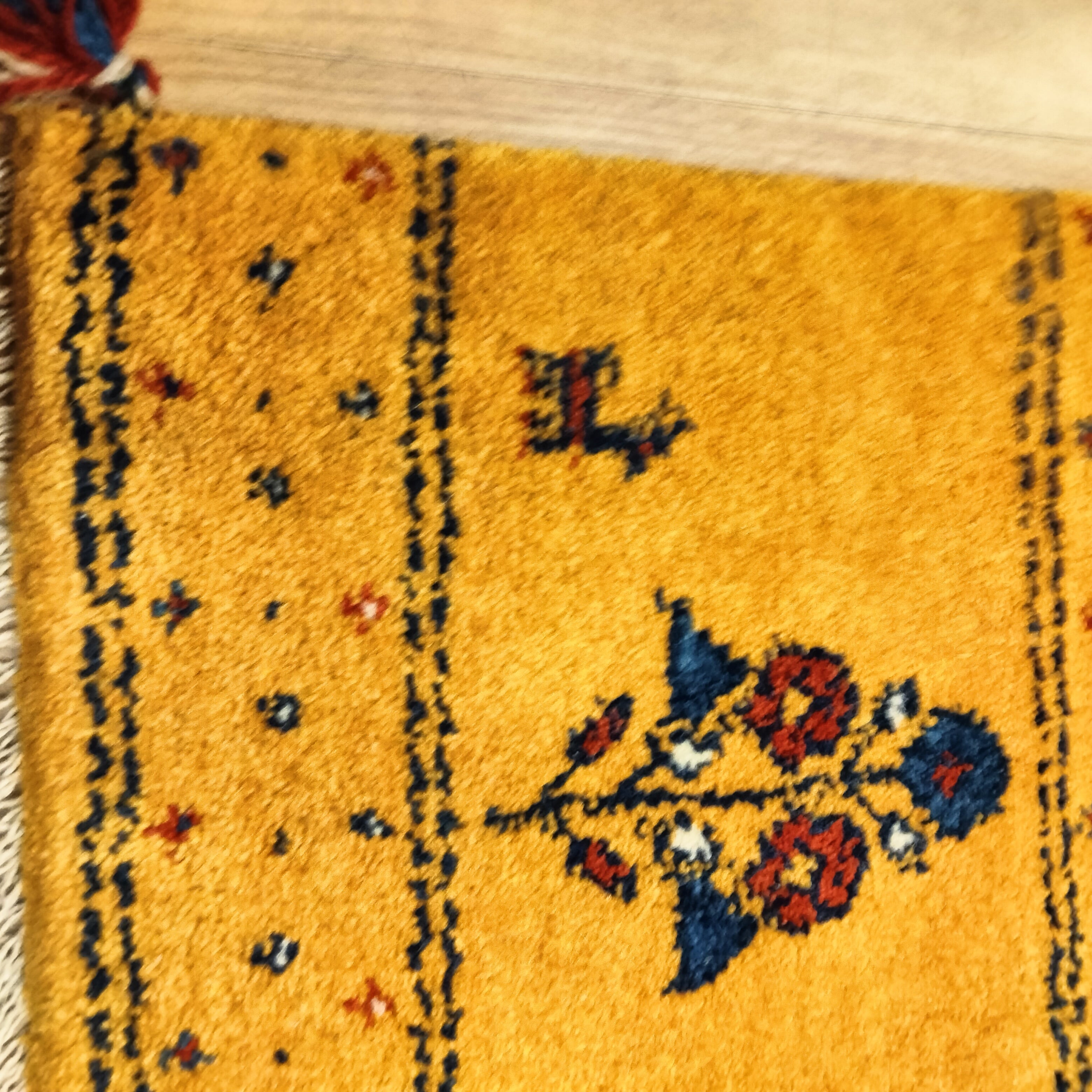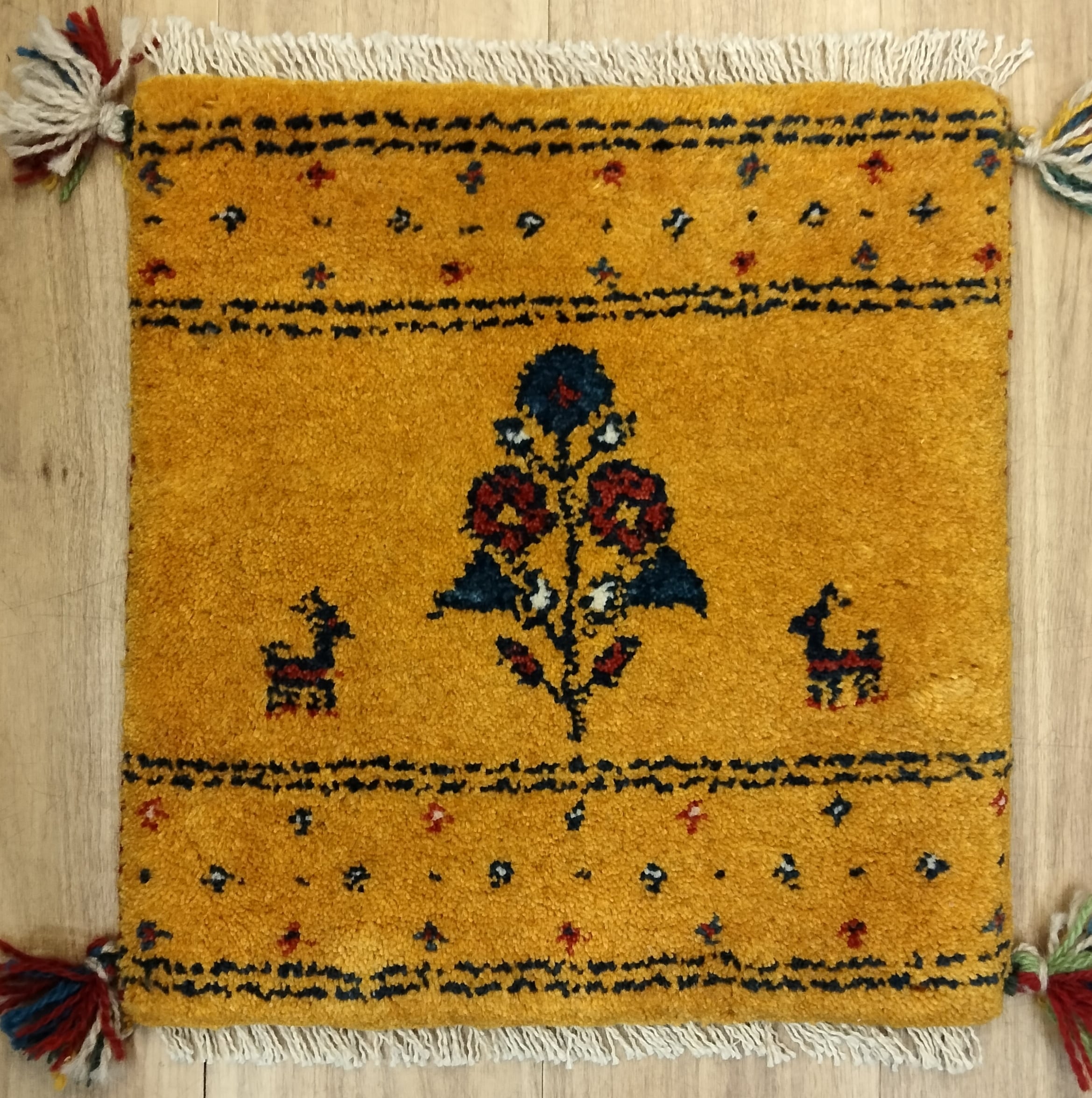 本場イランのペルシャンギャッベ、座布団サイズの約40cm角です。コンパクトながらも、その存在感はお部屋の雰囲気を引き立ててくれます!