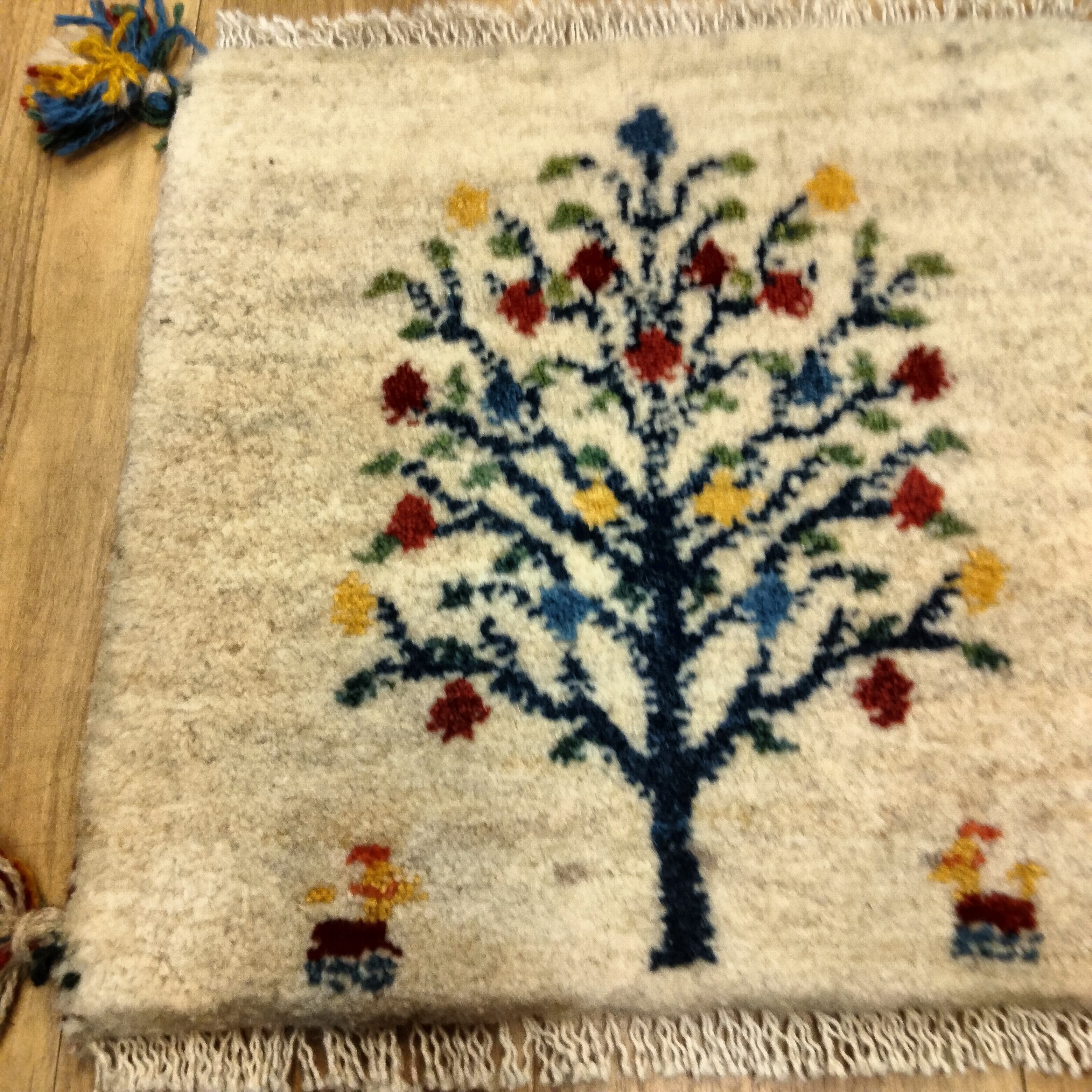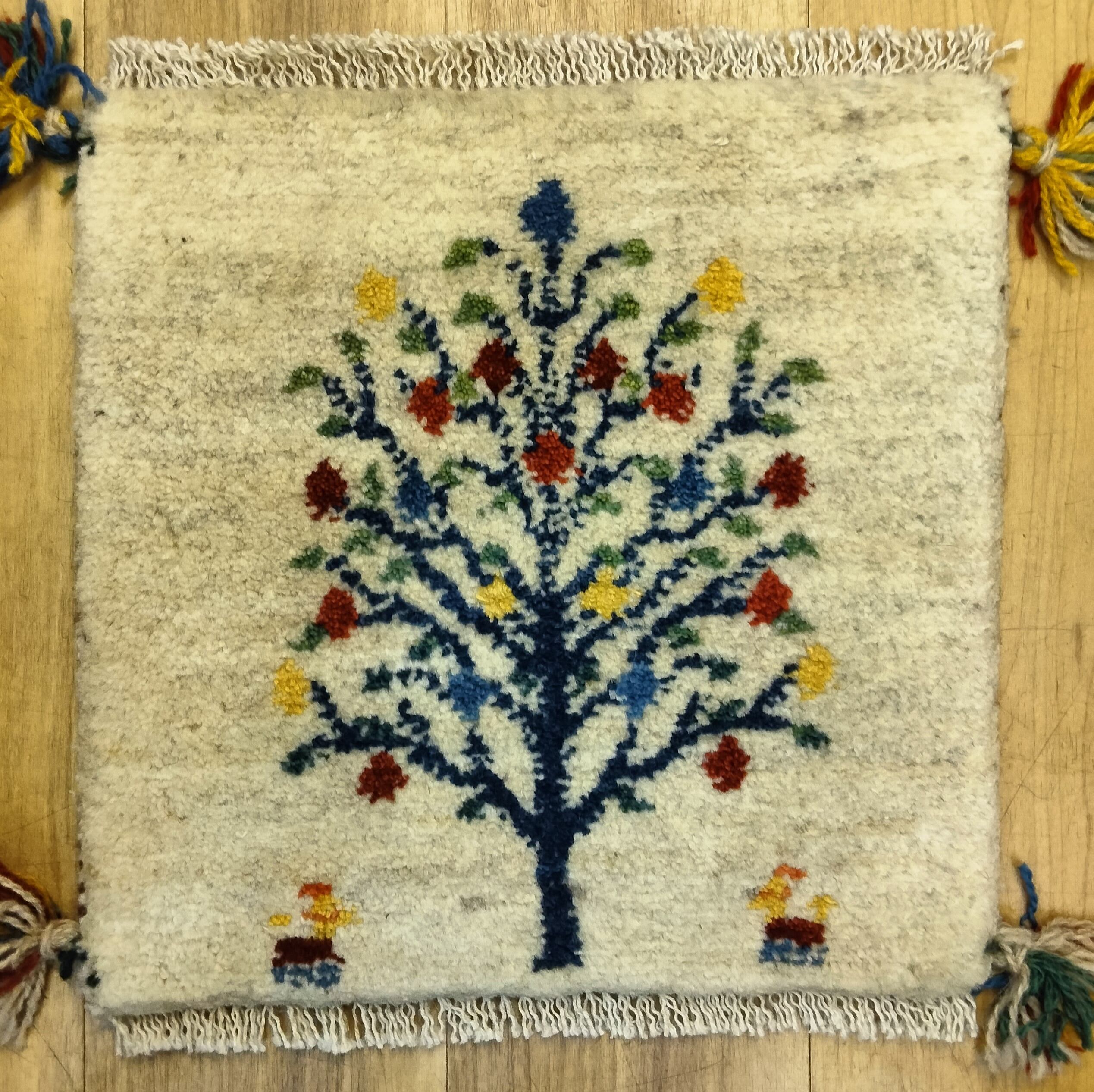 本場イランでウール100%手結び手織りされたペルシャンギャッベの座布団サイズ、約40cm角です。肉厚フカフカな仕上げが特徴で、椅子やソファーの座面にぴったりフィットします。コンパクトなサイズでも、その存在感は間違いなくお部屋の雰囲気を一層引き立ててくれることでしょう!