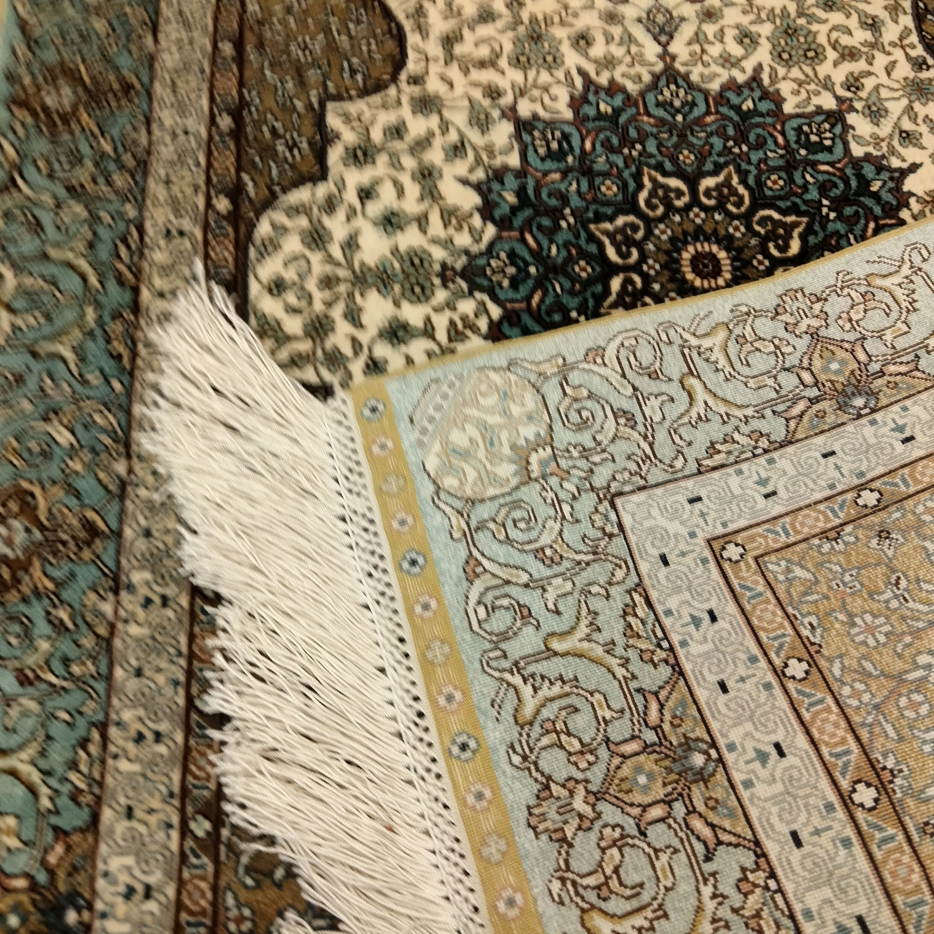 シルクonシルクで手結び手織りされたヘレケ絨毯です。1cm四方に13x13の細かさで