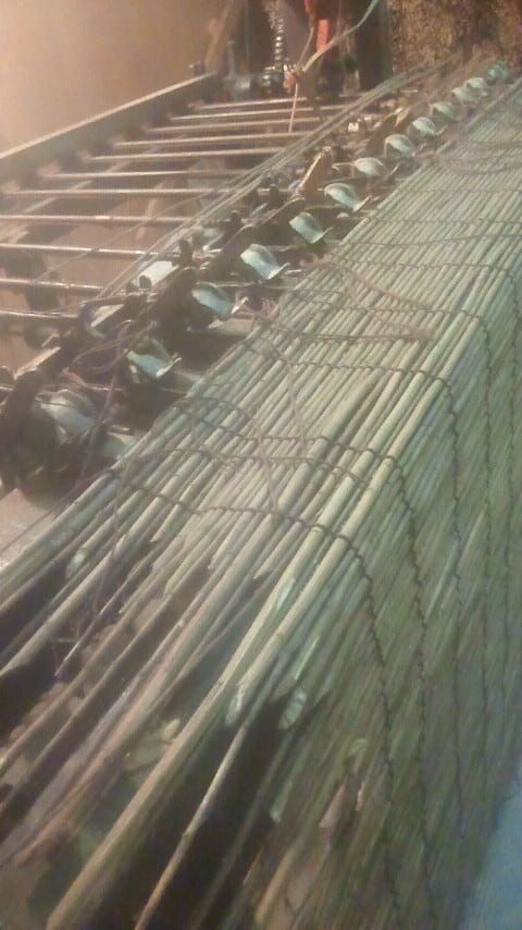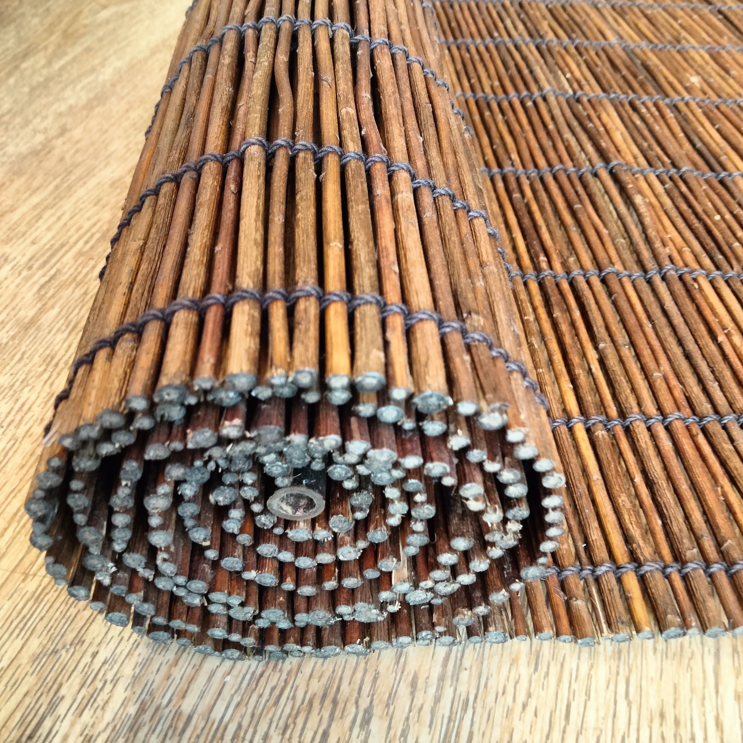 埼玉県や茨城県で採取した山野草の茎を天日干しして色出し、木状化させた貴重な材料を東京で織りあげた江戸簾鬼萩です。関西では代萩と言う名で売られて居ます。編み下がりはおおよそ175cmですが、綿糸で織って居ますので湿度で伸び縮み致します。又、吊り下げてお使い頂くうちに次第に綿糸が伸びて編み下がりも伸びて行きます。室内、室外でお使い頂けます。