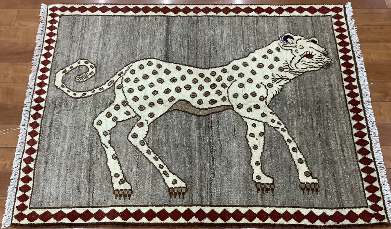 ペルシャ絨毯シラーズ グレーのナチュラルベースに精悍な白ヒョウが素敵です。サイズは106x147cm ザロニムです。