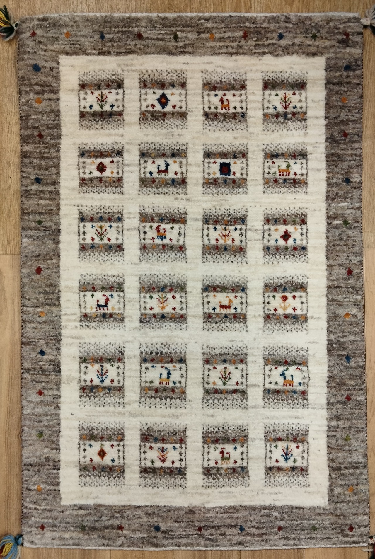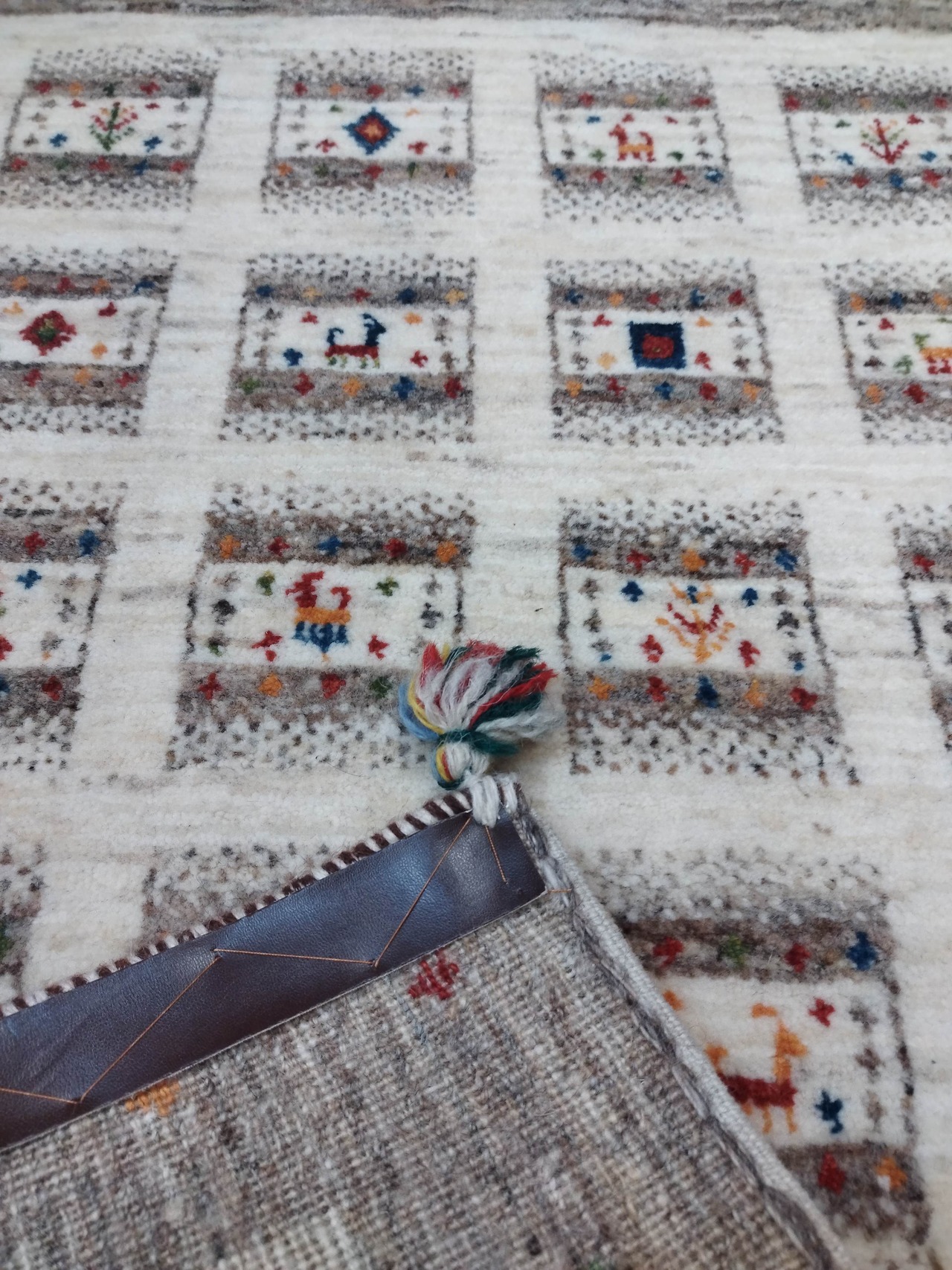 本場イランのペルシャンギャッベ絨毯 リズバフト細かい織り 81x127cmです。手結び手織りで織られた丈夫な作りですので安心してお使い頂けます。大きめの玄関やベッドサイドなどに如何でしょうか?ナチュラルベースの優しい色合いで柔らかな肌触りです。